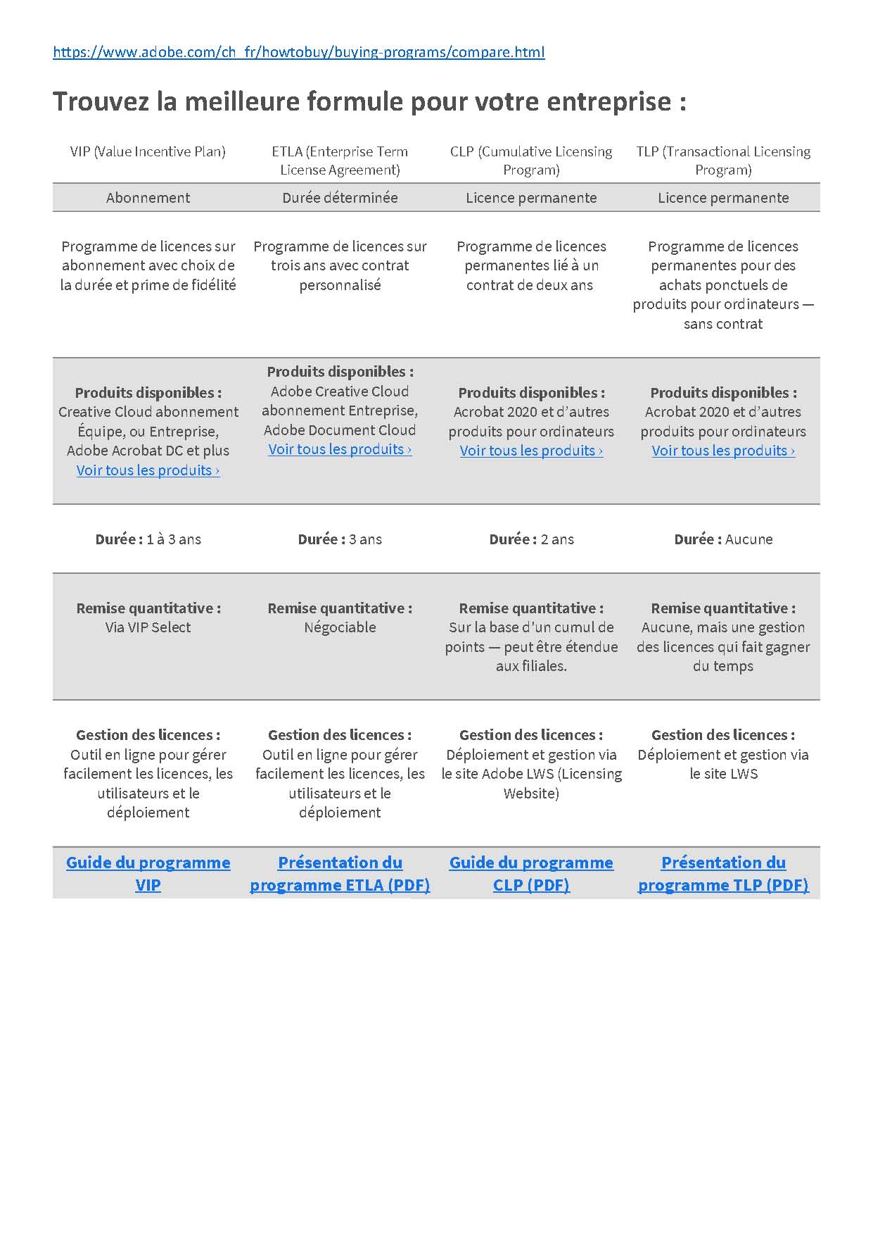 | Programme de licences sur abonnement avec choix de la durée et prime de fidélité | Programme de licences sur trois ans avec contrat personnalisé | Programme de licences permanentes lié à un contrat de deux ans | Programme de licences permanentes pour des achats ponctuels de produits pour ordinateurs — sans contrat |